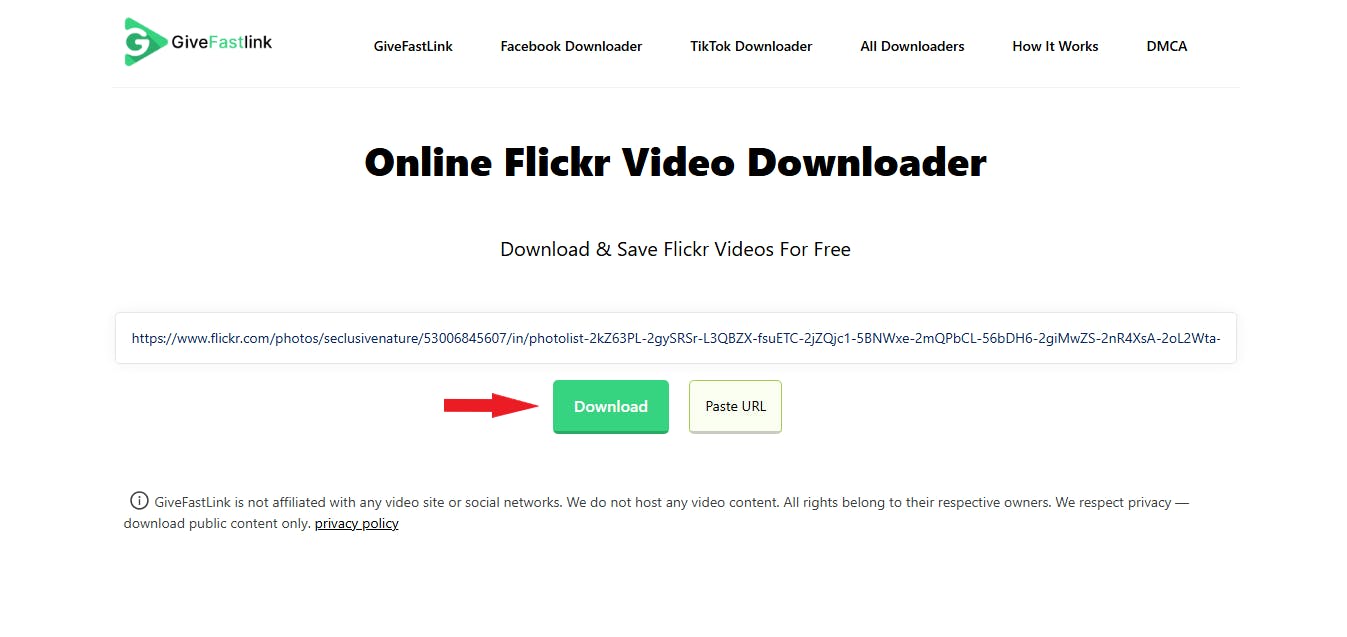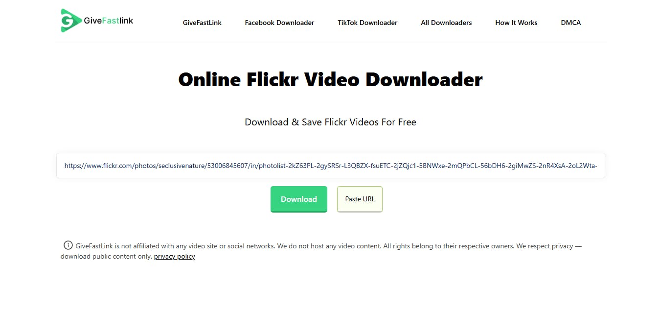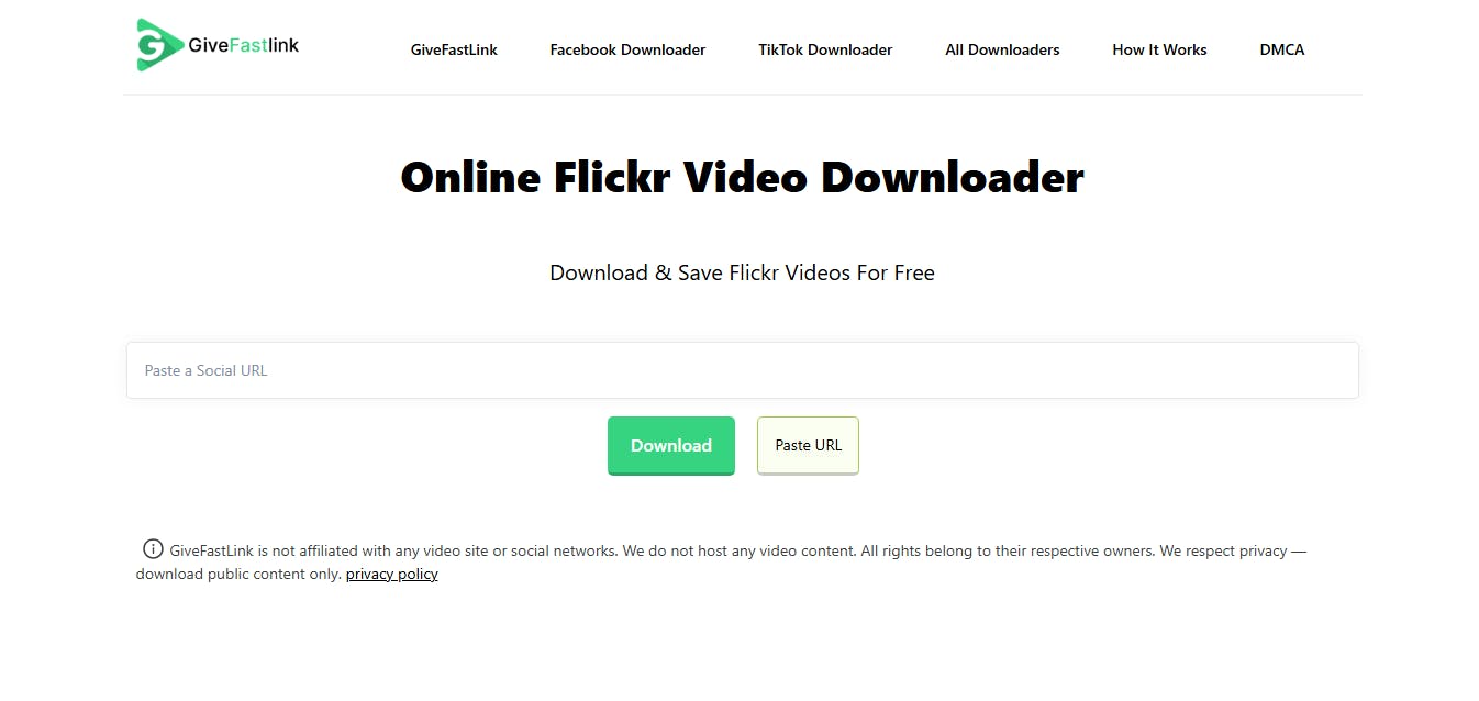 GiveFastLink is a free online tool that lets you download videos from various websites, including Flickr, without installing any software. It’s simple to use and works directly in your browser.